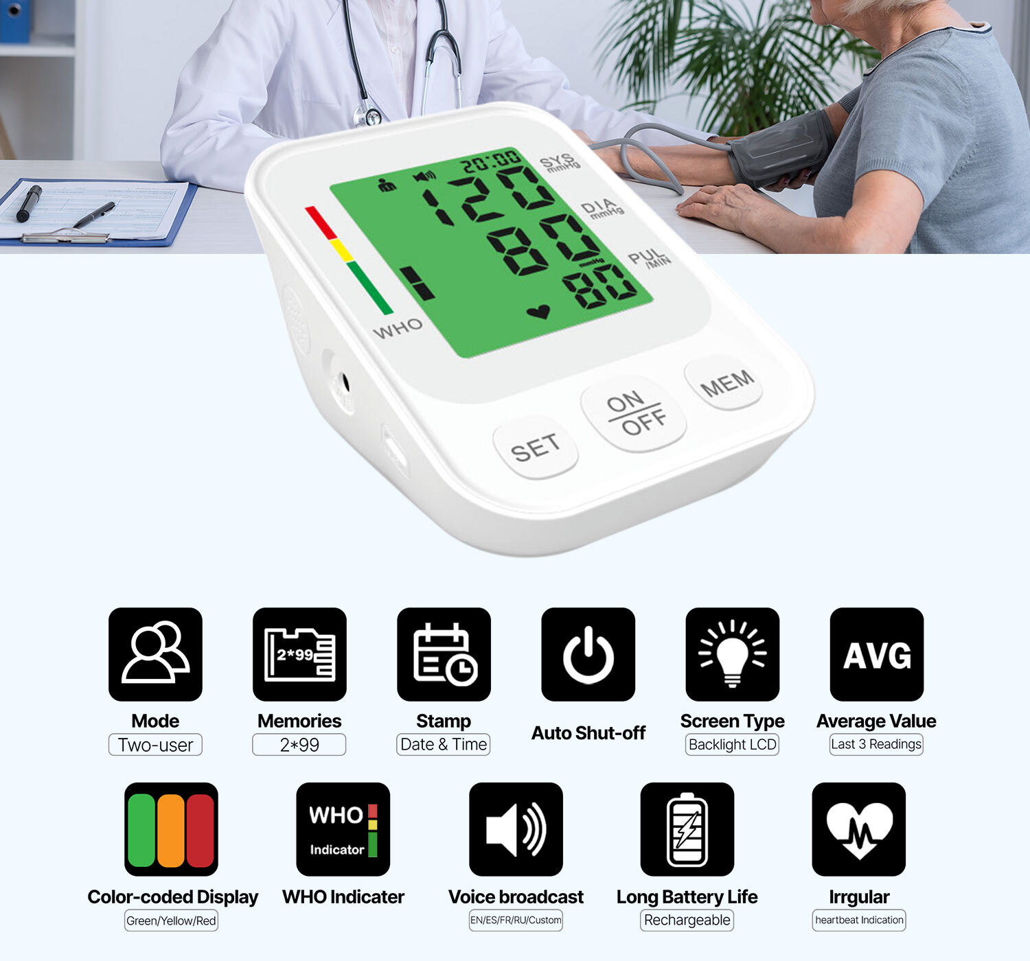 This is a basic fully automatic type of medical blood pressure machine for upper arm. it detects irregular heartbeats, features a WHO color-coded risk indicator for easy reading and has a daul-user capacity of 99 memories each. It's designed for convenient, reliable monitoring at home.