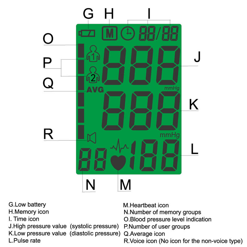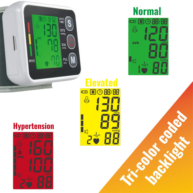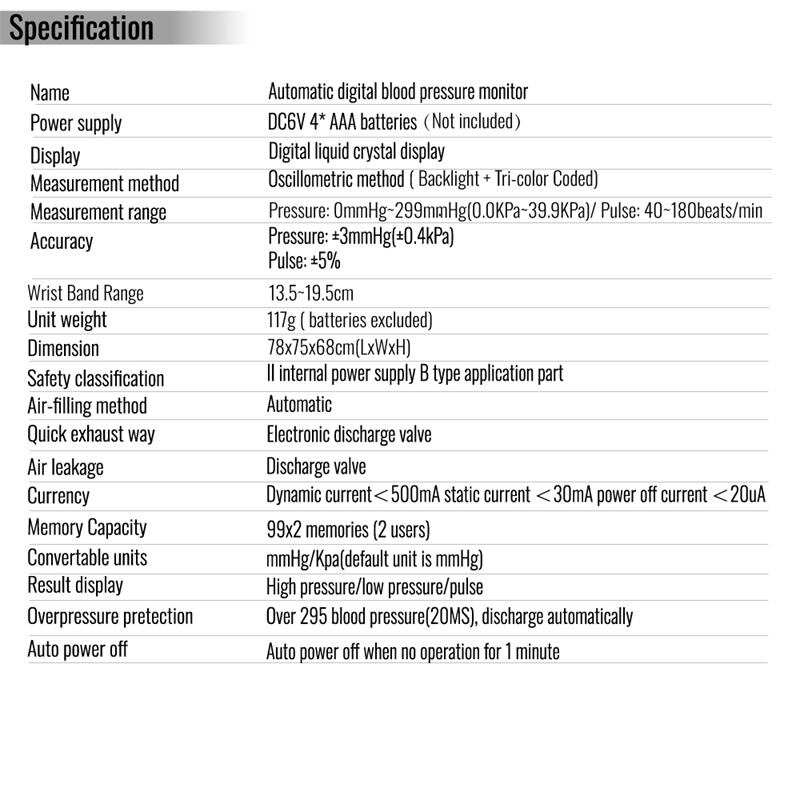 Monitor tekanan darah untuk pergelangan tangan ini dirancang untuk pemantauan detail dari rumah. Fitur unggulannya adalah tampilan tingkat tekanan darah (BP) dalam lampu latar berkode warna terkait. Fitur pengaturan volume suara tambahan ditambahkan guna meningkatkan pengalaman pengguna.